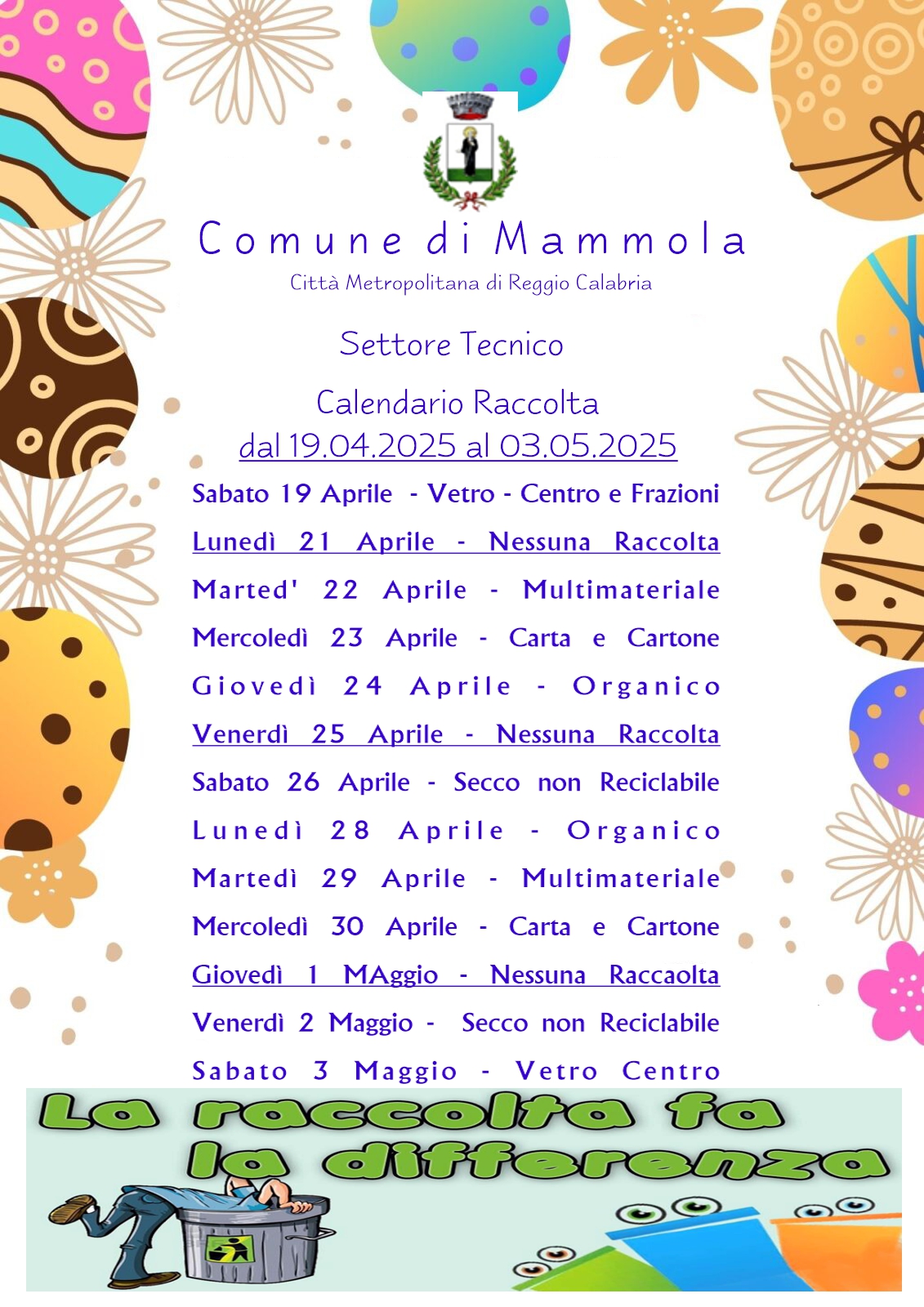 Calendario raccolta differenziata dal 19/04/2025 al 03/05/2025
